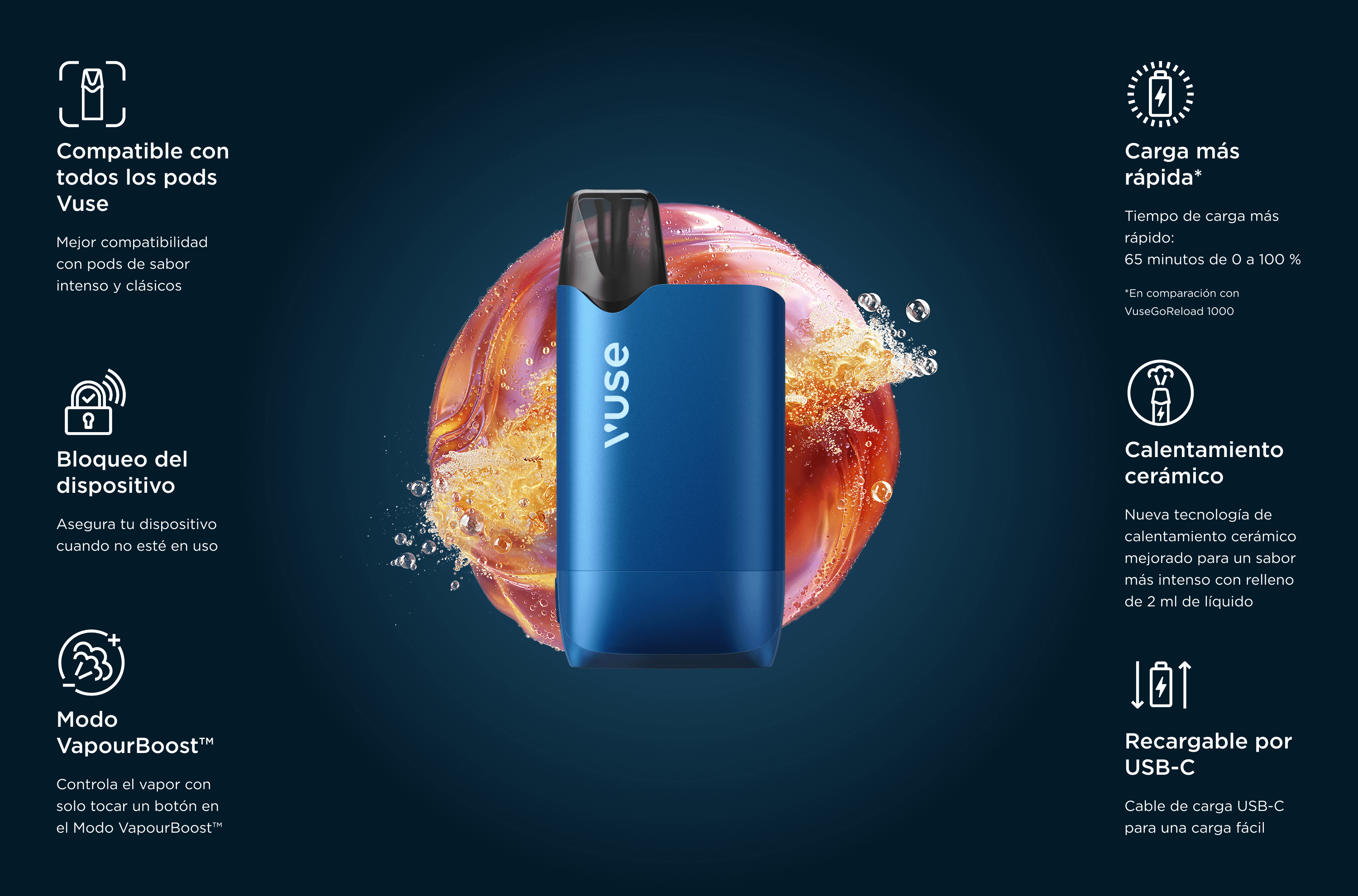 *Basado en pruebas de laboratorio del dispositivo recién fabricado, con una duración de puff de un segundo y puede variar en función del uso de cada persona. Para más información, visite: https://vuse.es/preguntas-frecuentes.